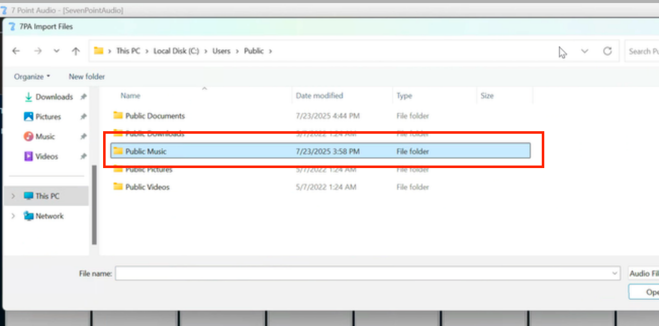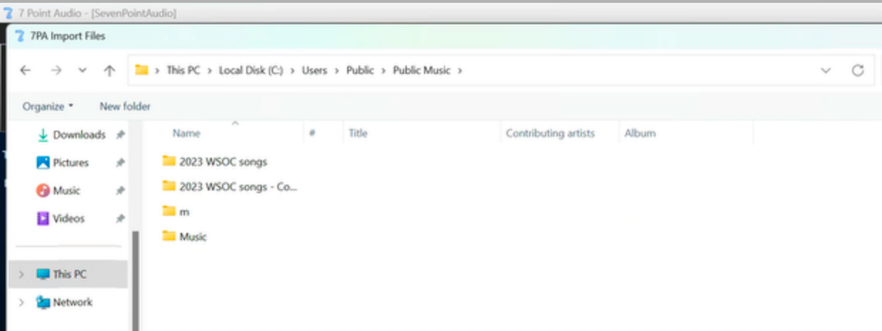 Inside the Public Music folder, you will see shared subfolders (e.g., game-specific or event-specific). Save all music files here.