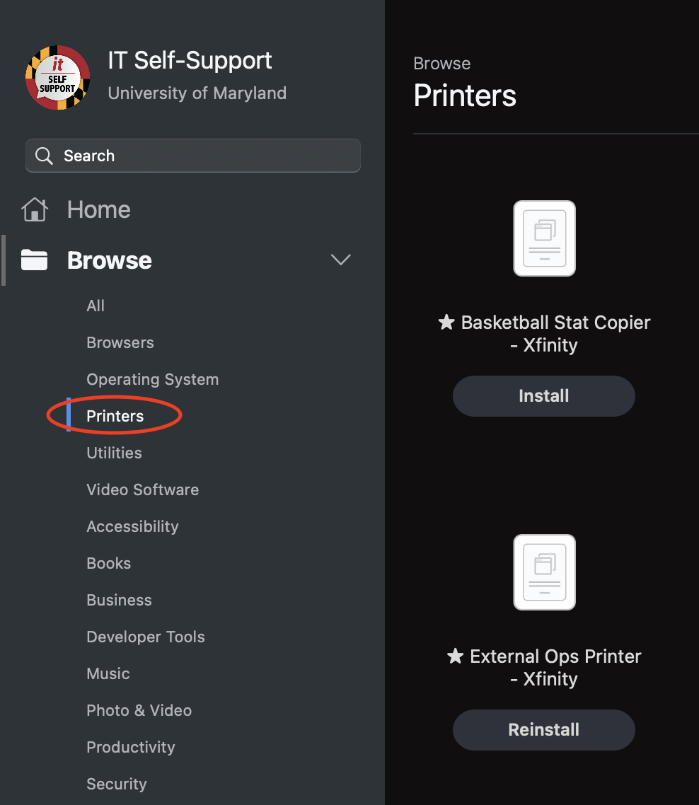 To install printers you will need to access our IT Self-Support application. Navigate to IT Self-Support and from there to the Printers tab under Browse on the side-menu. This app can also be used to download a handful of other apps available to you.