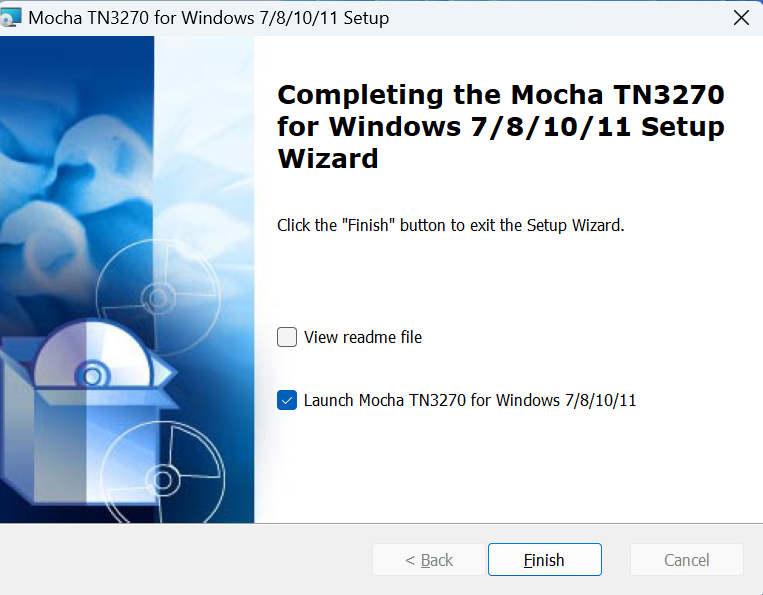 A Windows security pop-up screen will appear. Click on the Run button. With the subsequent prompts click Next and finally click Install. On the last prompt check the box ‘Launch Mocha TN3270 for Window’ and then click the Finish button.